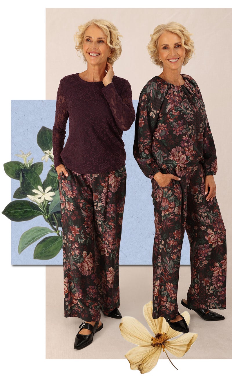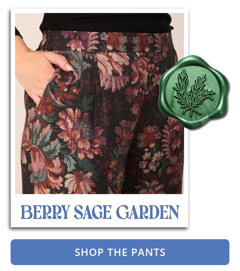 If you are liking what you see, this Berry Sage Garden print also comes in an easy pull-on pant. These feature a flattering flat front and an elastic back for comfort. They also have angled pockets if you like them, and I know many of you do. These pants represent effortless dressing in a soft viscose. You can wear them with a plain top and add a blazer or jacket if need be. Alternatively, you could wear the matching print top, which gives a totally different look and vibe altogether. Wearing the same print all the way through creates an elegant, sophisticated look that is easy to wear and hasn’t cost moonbeams.